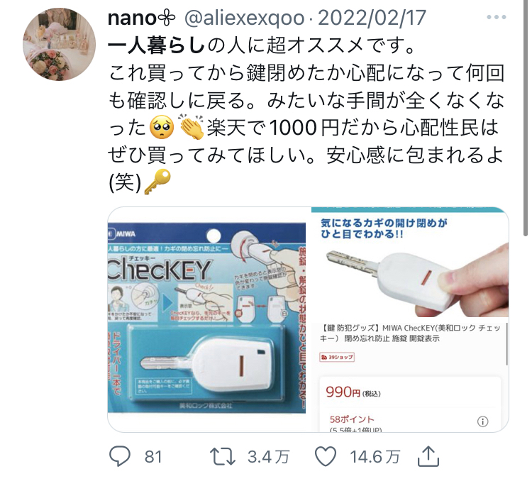 【画像】Twitter民「家の鍵閉めたか心配になる人、ガチでこれ買え」→14.6万いいねWWWWWWWWWWWWWWWWWWWW