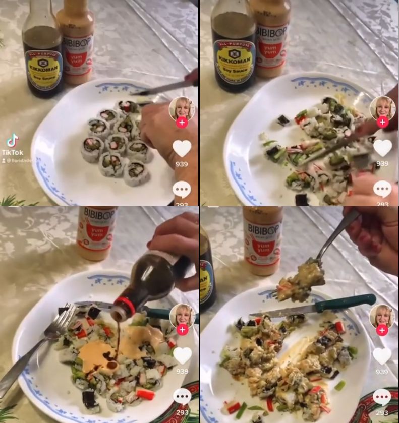 スレッド「お前らはちゃんと寿司が好きだよな?」より。フォークとナイフで寿司を刻み、ビビンバソースと醤油をかけて食べる女性の様子が海外で話題を集めていたので反応をまとめました。