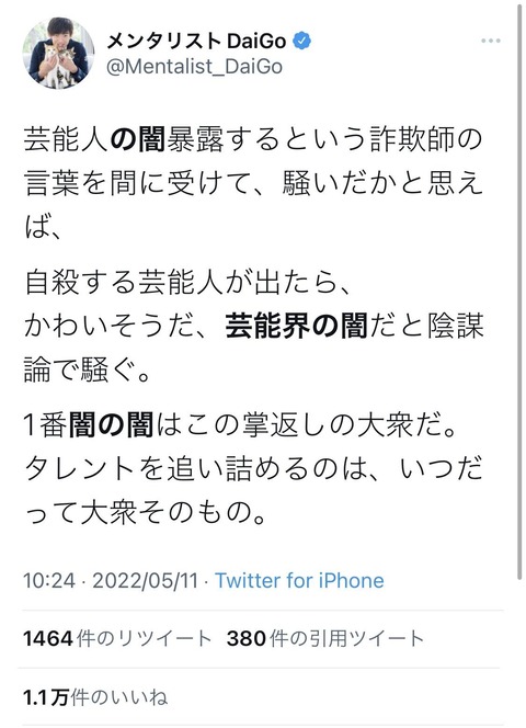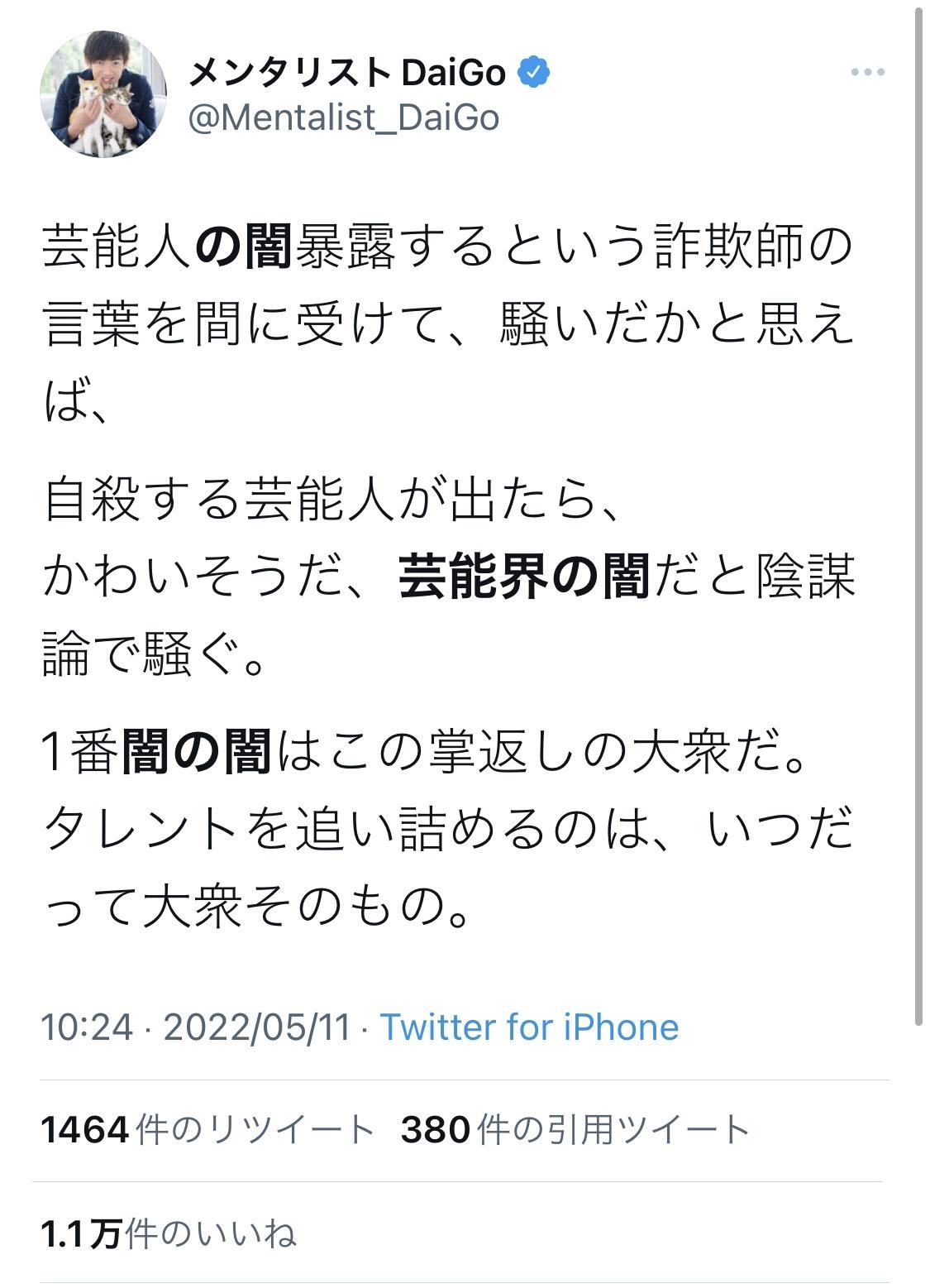 【悲報】DaiGoさん、正論をかます「上島竜兵を自殺に追い込んだのはお前ら大衆だ。」