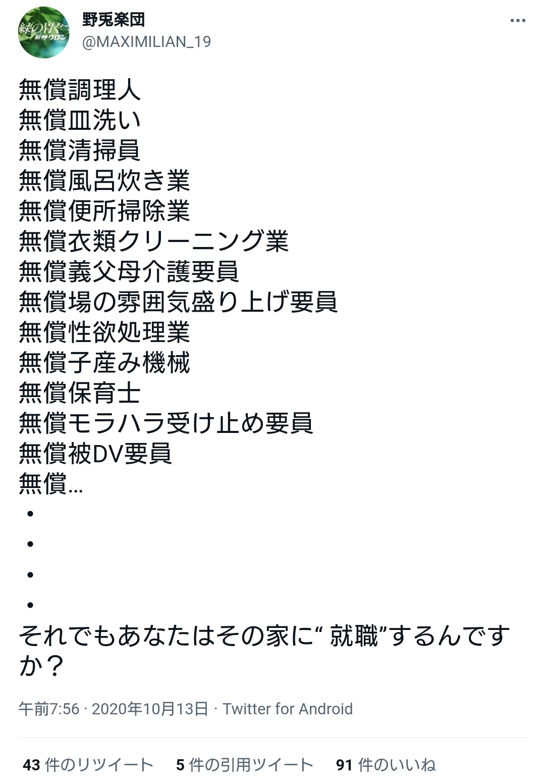 女さん「無償調理人、無償皿洗い、無償性処理業、女性の皆さんこれを見ても男に”就職”しますか?」