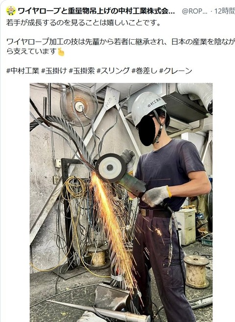 同社は6月9日に問題のツイートを投稿。「若手が成長するのを見ることは嬉しいことです。ワイヤロープ加工の技は先輩から若者に継承され、日本の産業を陰ながら支えています」とのコメントを添えて、作業員の仕事風景の写真を投稿しました。
