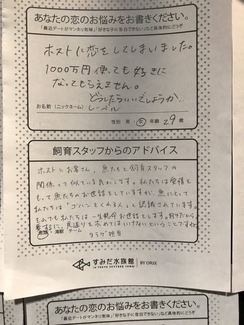 【画像】ホスト狂いのまんさん、水族館の飼育員にアドバイスされるwwwwwwwwwwwwwwwwwwwwwwwwwwww
