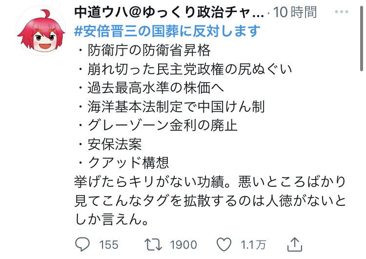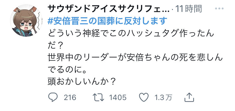 ホーム > ニュースetc > 【画像】Twitterで「安倍晋三の国葬に反対します」というハッシュタグがトレンドにWWWWWWWWWWWWWWW 2022/07/12 1: くーるびゅー 2022/07/12(火) 06:34:29.764 ID:xDT1GsUBp.net 「安倍晋三の国葬に反対します」に反対する人たち いいねの数からこれが民意だとわかる 2: くーるびゅー 2022/07/12(火) 06:35:02.342 ID:L/XO3yvhp.net みんなは反対?賛成? 続きを読む Source: 妹はVIPPER - ニュースetc