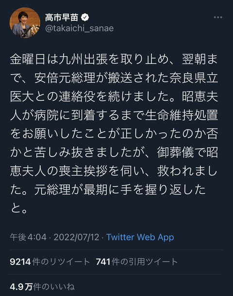 【驚愕】安倍晋三さん、5時間の心肺停止後に昭恵の手を握り返していたことが判明