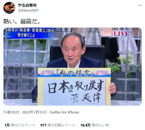 【感動】菅ちゃん「日本を取り戻す」 10万いいね (※画像あり)
