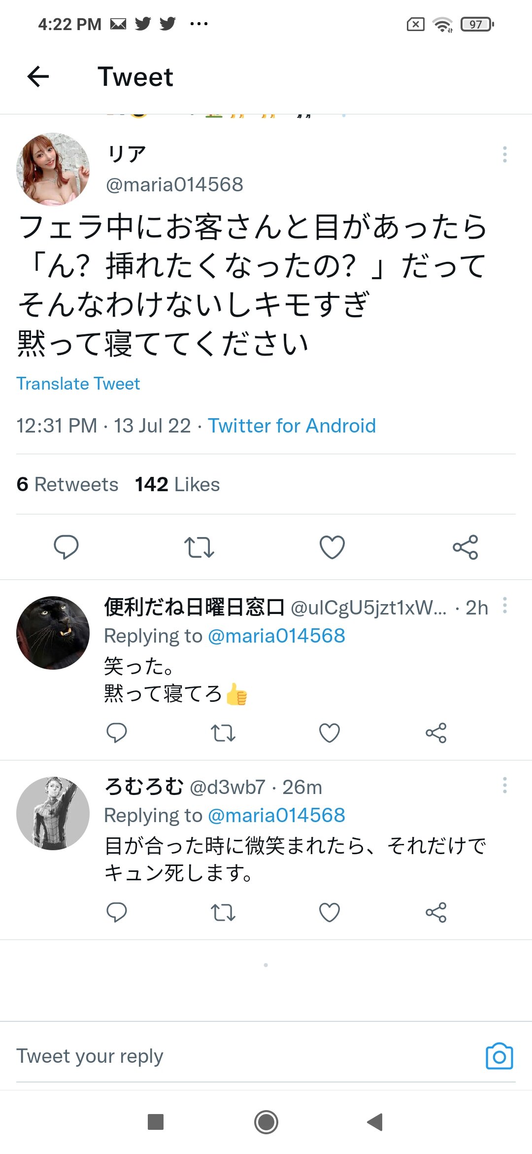 ホーム > ニュースetc > 【画像】風俗嬢まんさん、客に対する本音を吐露してしまう。 2022/07/18 1: 以下、?ちゃんねるからVIPがお送りします 2022/07/13(水) 16:23:35.480 ID:gRszAEzLM.net 続きを読む Source: 妹はVIPPER - ニュースetc