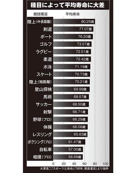 ホーム > ニュースetc > 【画像】アスリートの種目別平均寿命がこちら・・・・ 2022/09/17 1:以下、?ちゃんねるからVIPがお送りします:[ここ壊れてます] .net 2:以下、?ちゃんねるからVIPがお送りします:[ここ壊れてます] .net 相撲とボクシングはしゃーないとしても自転車って身体に悪いのか 続きを読む Source: ラビット速報 - ニュースetc