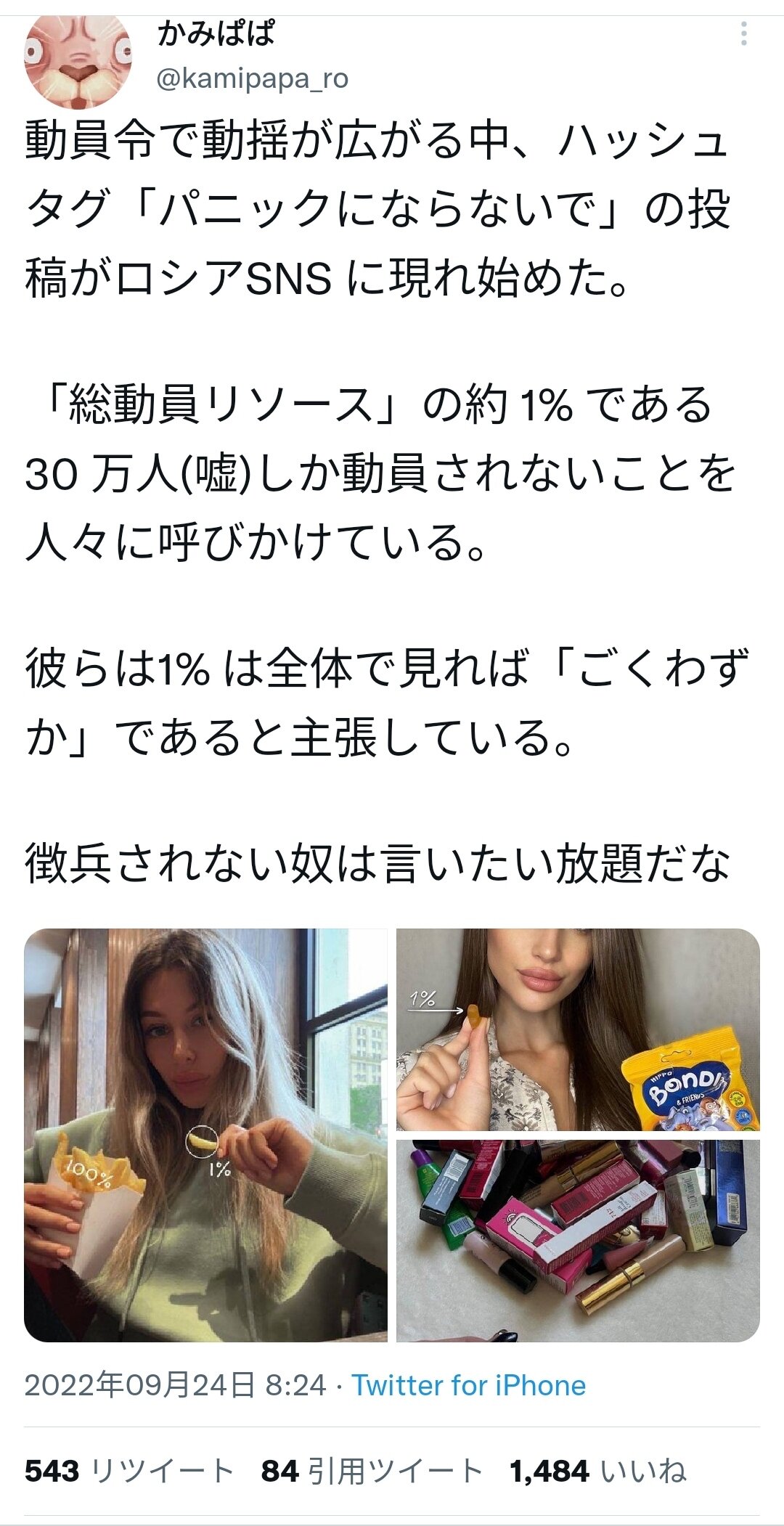 ホーム > ニュースetc > 【画像】ロシア膣「えw徴兵されるのってたった1%でしょwパニックになってる男共かっこわるw」パシャ 2022/09/26 1: 風吹けば名無し 2022/09/26(月) 03:37:56.51 ID:rA/kM+za0.net 続きを読む Source: 妹はVIPPER - ニュースetc