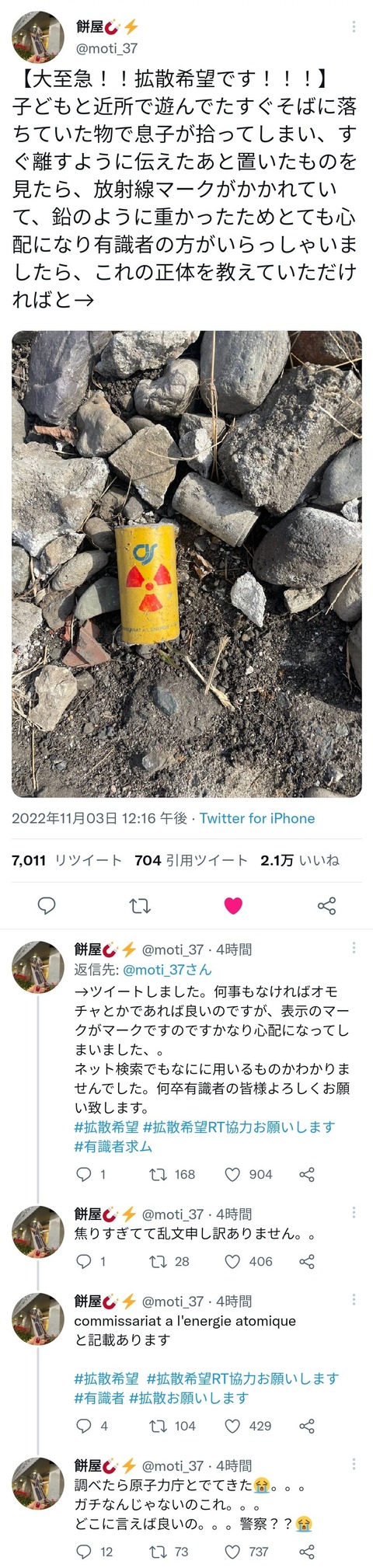 ホーム > ニュースetc > 【画像】 ツイッター「息子がヤバいもの拾ったの😱見て」→2万いいね! 2022/11/03 1::2022/11/03(木) 18:31:18.52 ID:WU2A30Zq0 BE:227847468-2BP(1500) 4::2022/11/03(木) 18:32:14.17 ID:FD8gr7qu0.net もう被爆 5::2022/11/03(木) 18:32:19.90 ID:Tz8cOHjy0.net ジョークアイテムだろ 続きを読む Source: ラビット速報 - ニュースetc