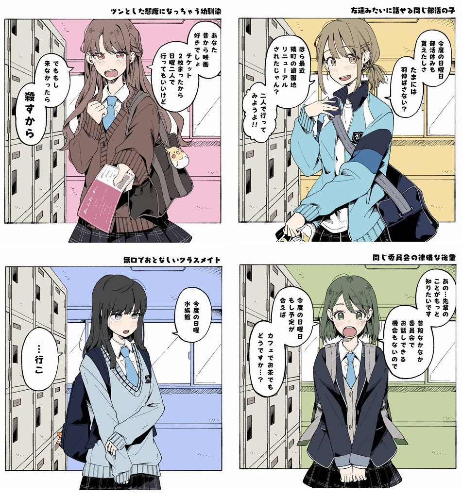 ホーム > ニュースetc > 外国人「日本の女の子のデートの誘い方、お前らなら誰を選ぶ?」 2022/11/13 スレッド「お前らみたいなプレイボーイは誰の誘いを受ける?」より。引用:4chan (海外の反応) 1万国アノニマスさん お前らみたいなプレイボーイは誰の誘いを受ける? 2万国アノニマスさん 迷うまでもなく青、みんな可愛いけど 3万国アノニマスさん 人生でたくさんの知恵を得てきたけど俺だったら胸の大きい子の誘いを受ける 続きを読む Source: 海外の万国反応記 - ニュースetc
