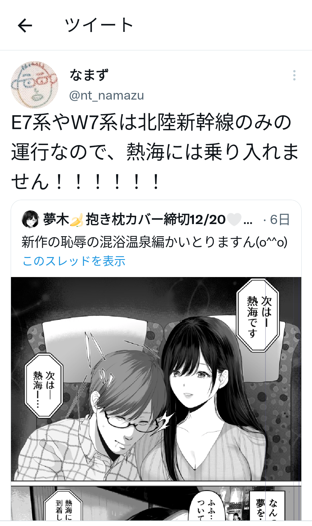 エロ漫画「熱海に到着しました」鉄オタ「E7系やW7系は熱海には乗り入れません!!」