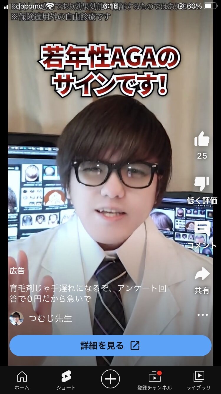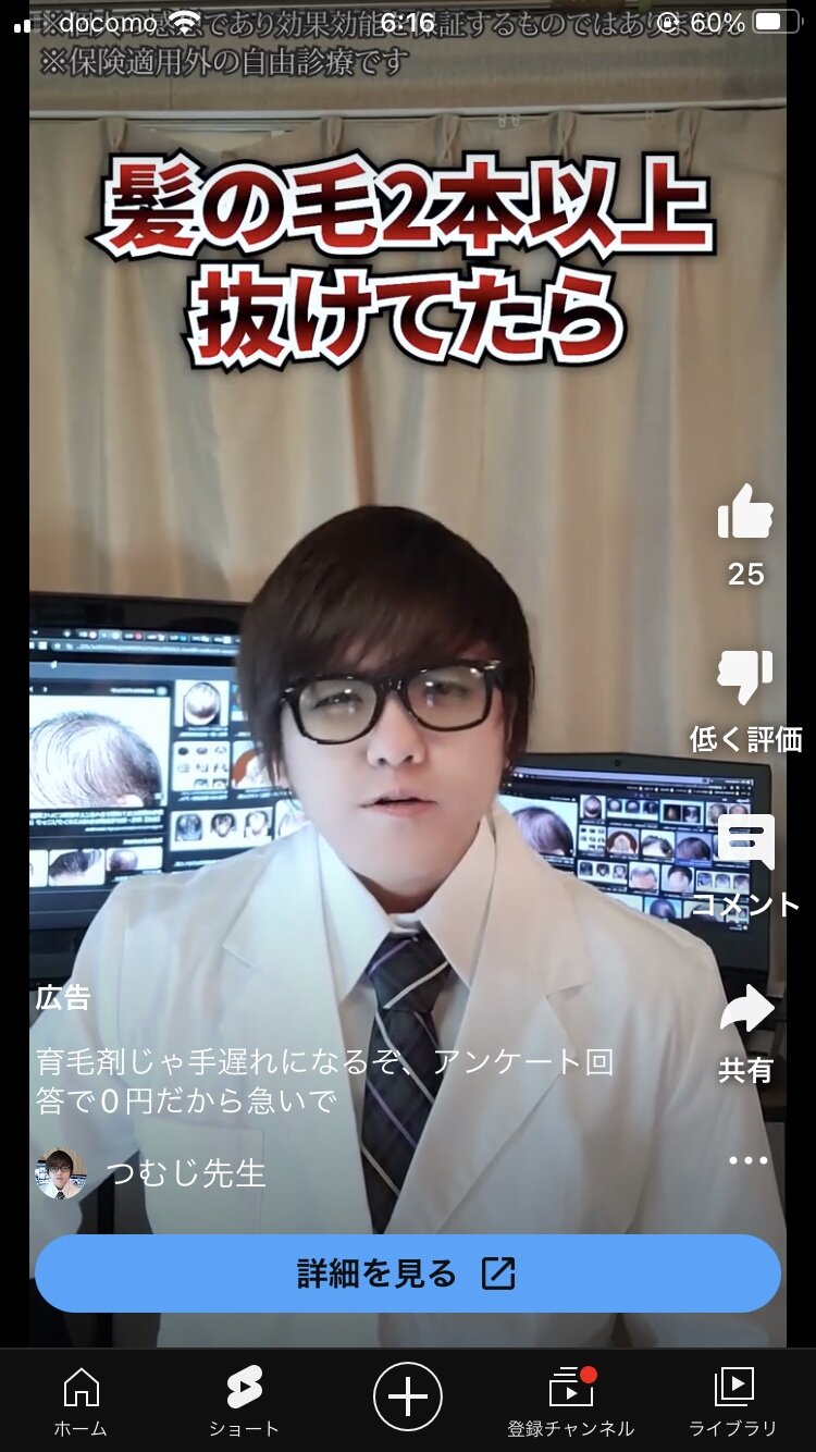 YouTubeの広告「ジャンプーした時に2本以上髪抜けてたら若ハゲです!」