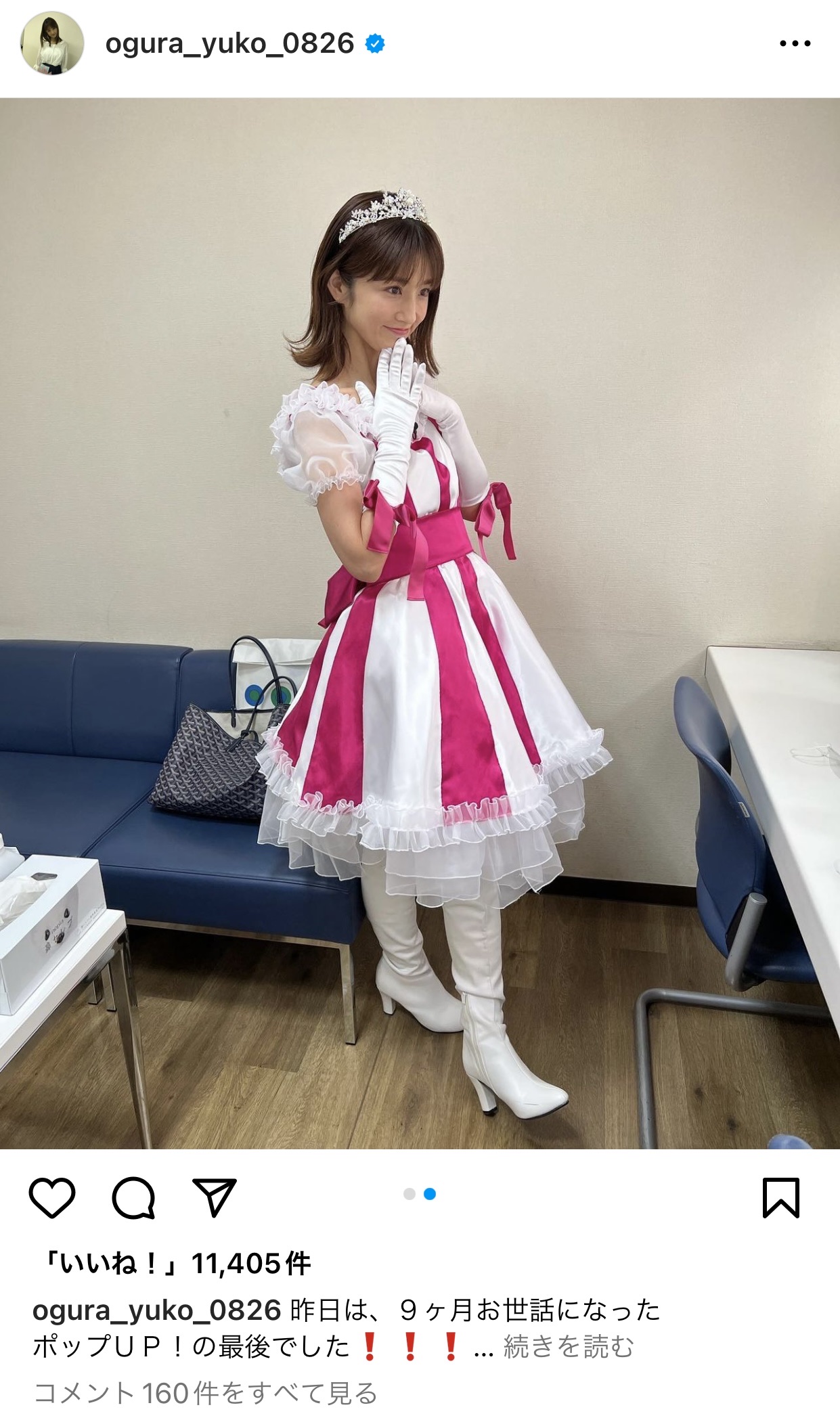 小倉さんは今回の投稿で、「昨日は、9ヶ月お世話になったポップUP! の最後でした」と花束を持ったソロショットを添えて最後の出演を報告。続けて、「まさかのこりん星から来たゆうこりんとして歌を歌いました 笑」と当時のアイドル衣装を完璧に着こなした“こりん星のゆうこりん”姿を公開しています。今でも似合うのスゴすぎる。
