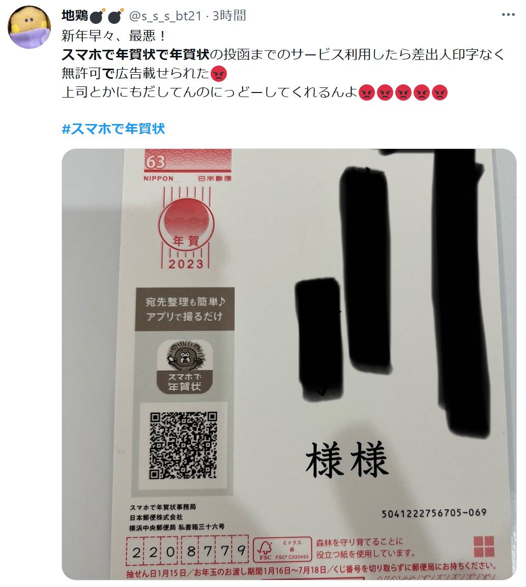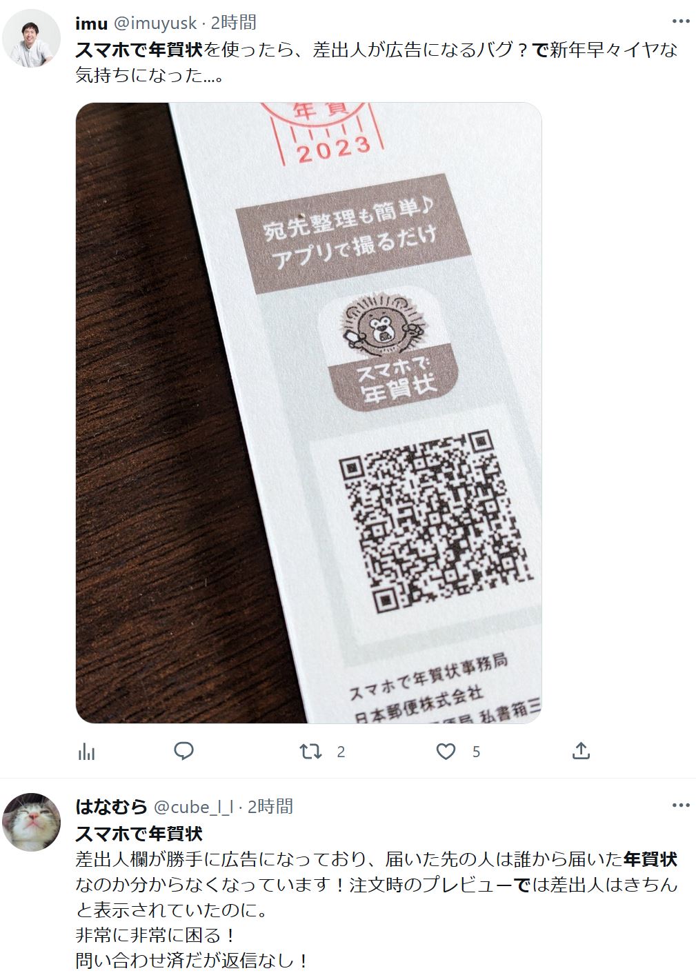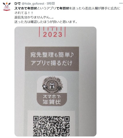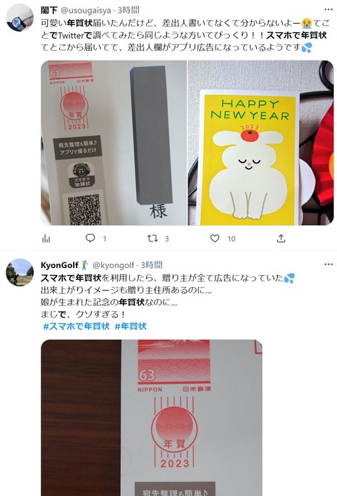 ホーム > ニュースetc > 「スマホで年賀状」が炎上中。年賀状の差出人欄が消されて広告になるバグが発生中wwwwwwwww 2023/01/01 1:風吹けば名無し:2023/01/01(日) 17:13:11.24 続きを読む Source: ラビット速報 - ニュースetc