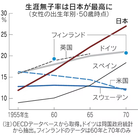 生涯にわたり子を持たない人が増えている。経済協力開発機構(OECD)のデータベースで最新となる1970年に生まれた
