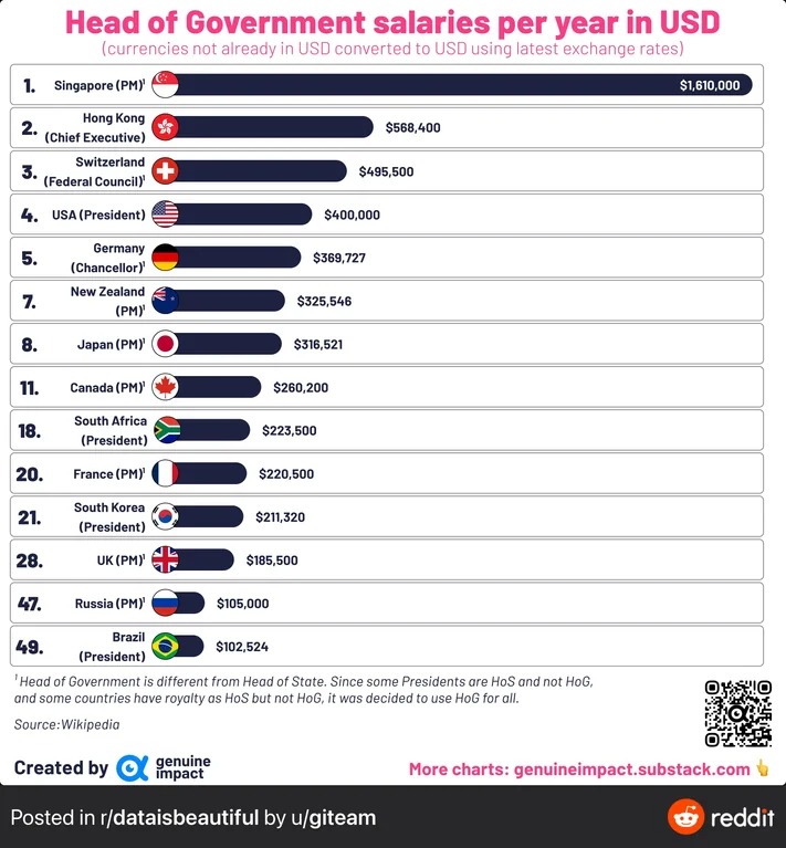 ホーム > ニュースetc > 世界の大統領&首相の年収ランキング 日本はトップ10にランクイン 2023/01/14 スレッド「世界の政府の長の年収」より。引用:4chan、Reddit② 続きを読む Source: 海外の万国反応記 - ニュースetc