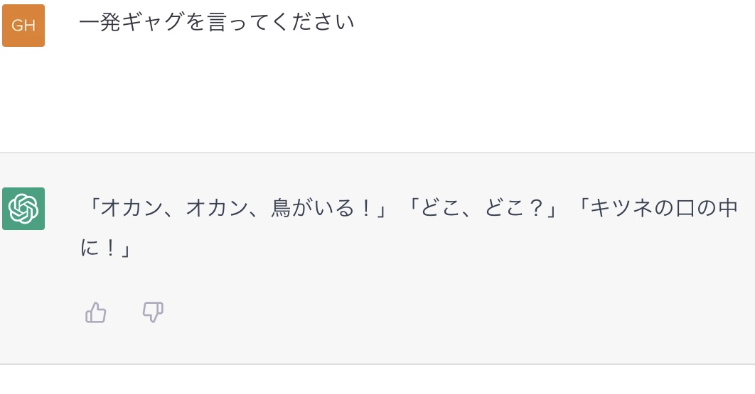 ホーム > ニュースetc > AIのギャグのセンス イカれてるwwwwwwwwww 2023/02/21 1:風吹けば名無し:2023/02/21(火) 12:06:42.73 ID:vC8wVDmR0.net なんやこれは 2:風吹けば名無し:2023/02/21(火) 12:07:46.55 ID:+Q2lMr1cd.net こういう人間には理解できない 上記を逸した世界観すき 続きを読む Source: ラビット速報 - ニュースetc