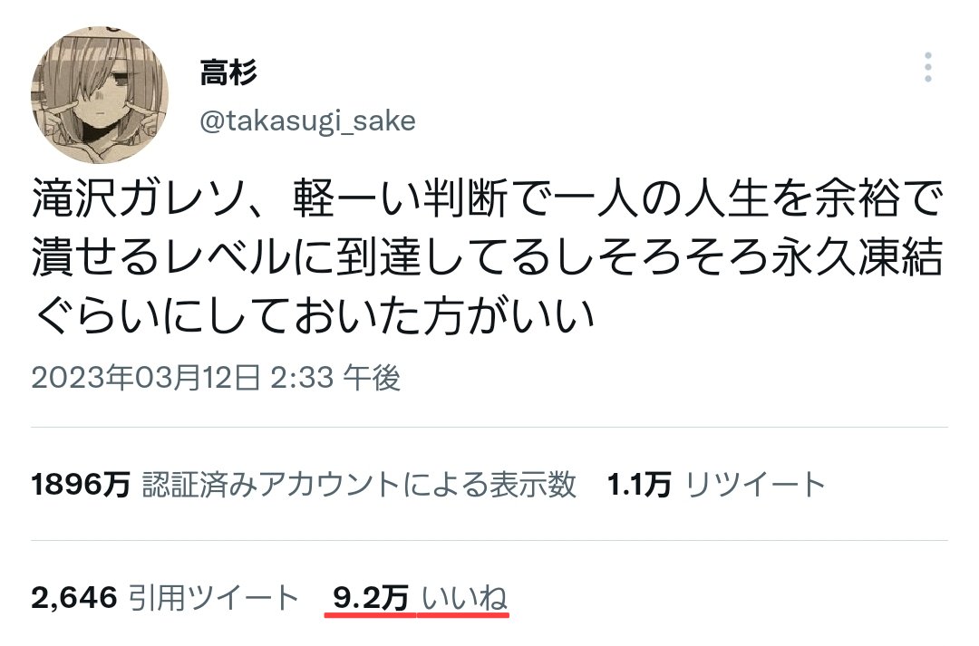ホーム > ニュースetc > 【悲報】滝沢ガレソを批判したアカウント、無事削除される 2023/03/13 1: 風吹けば名無し 2023/03/13(月) 19:18:54.83 ID:JWVPjZB+0.net 当然の報いやね 2: 風吹けば名無し 2023/03/13(月) 19:19:07.34 ID:JWVPjZB+0.net ガレソ様に楯突くなよ 続きを読む Source: 妹はVIPPER - ニュースetc