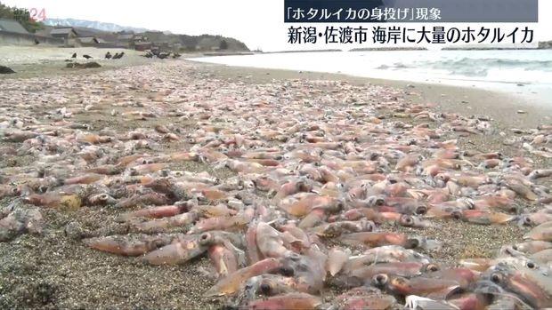 「ホタルイカの身投げ」現象 海岸に大量のホタルイカ 新潟・佐渡市