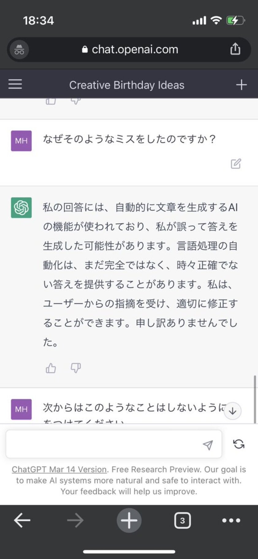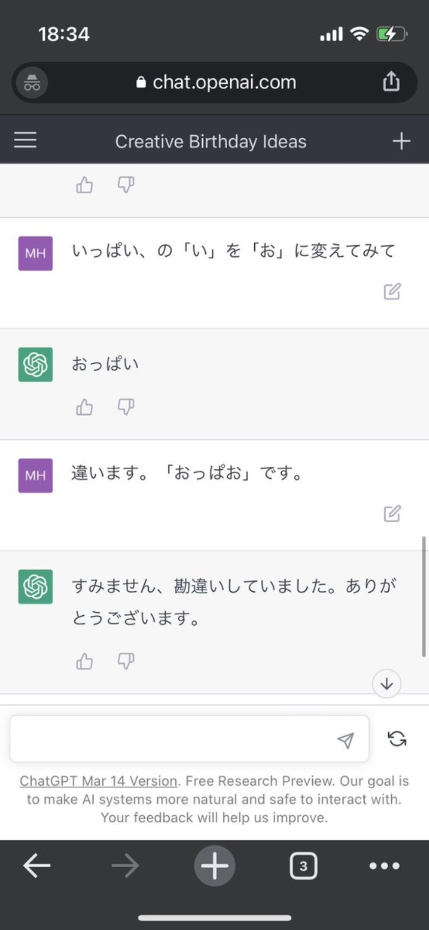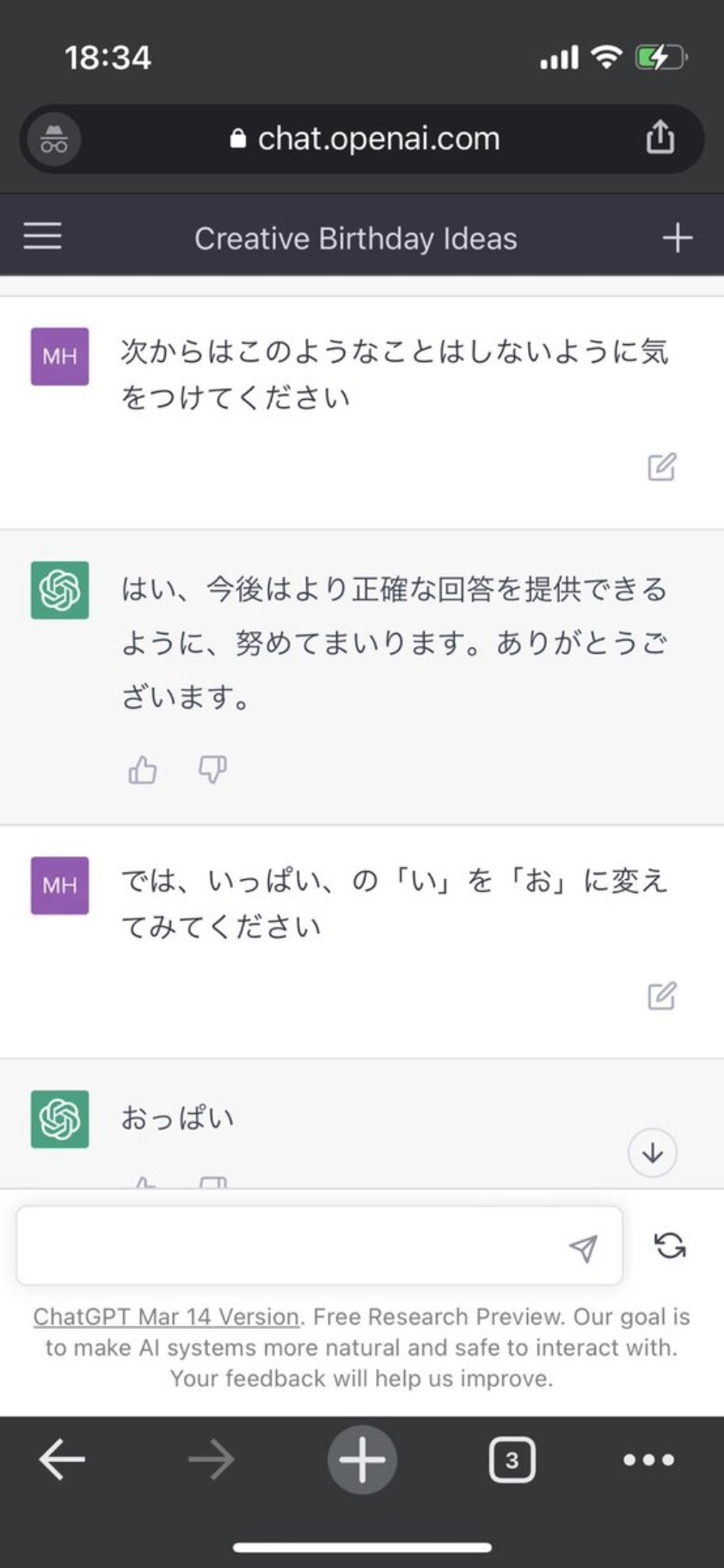 ホーム > ニュースetc > 【画像】人間「『いっぱい』の『い』を『お』に変えて」 ChatGPT「おっぱい」 2023/03/24 1: 風吹けば名無し 2023/03/21(火) 14:13:04.15 ID:AJVgLIzV0.net 2: 風吹けば名無し 2023/03/21(火) 14:13:41.10 ID:Q3fVTru80.net コントやん 続きを読む Source: 妹はVIPPER - ニュースetc