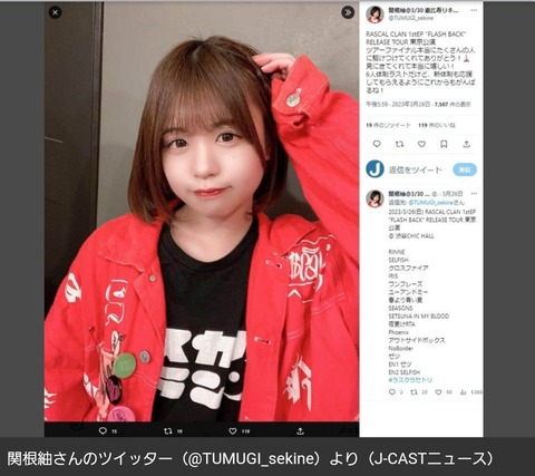 https://news.yahoo.co.jp/articles/6c0c994a84ce5c1cc6a5ee160bc990fb9df005e9アイドルグループ「RASCAL CLAN」の関根紬さん(23)が2023年3月21日、「ニューヨーク恋愛市場」(ABEMA)で経験人数や喫煙をぶっちゃけ、ファンの間に動揺が広がった。