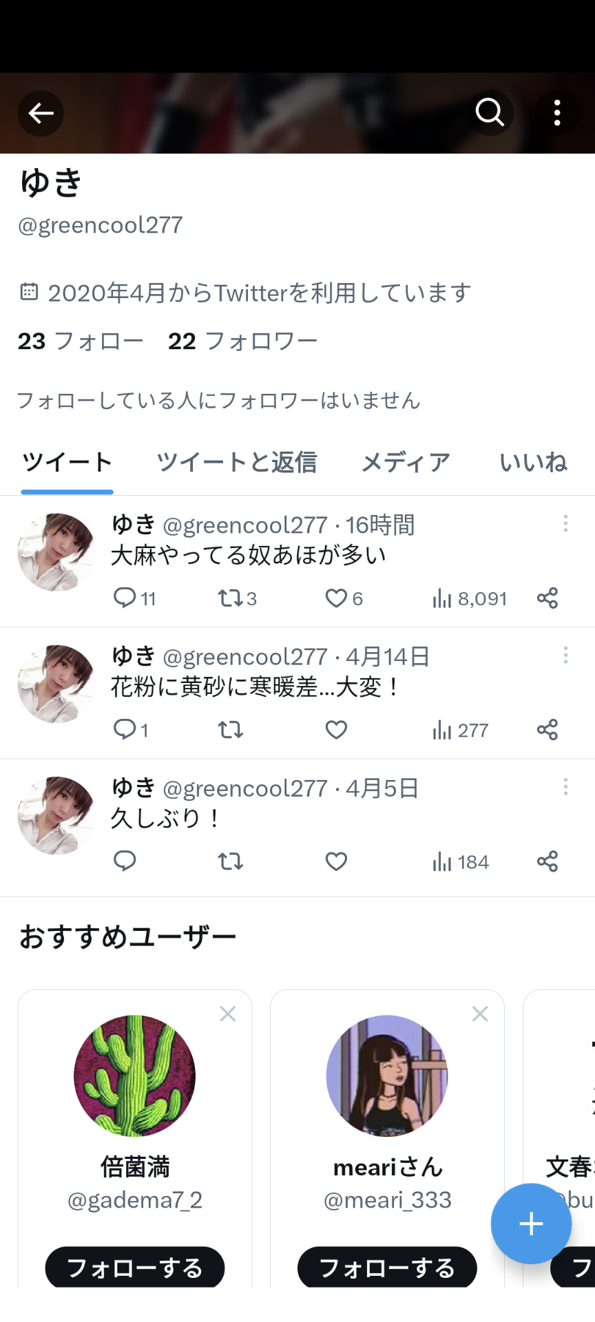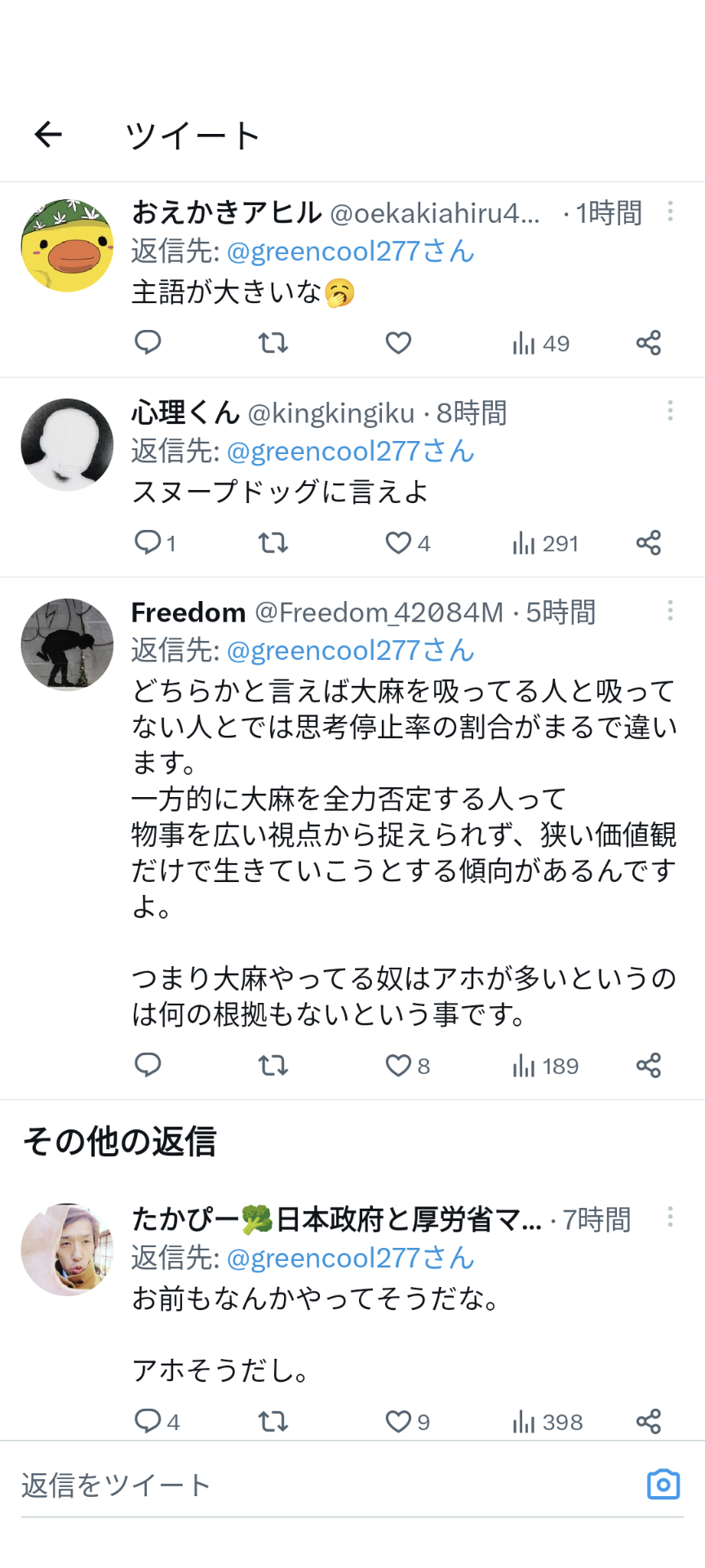 ホーム > ニュースetc > 【戦慄】ツイッターで「大麻」を批判するとこうなる 2023/05/04 1: 以下、?ちゃんねるからVIPがお送りします 2023/05/03(水) 16:39:24.751 ID:i7umQNnua.net こわ 続きを読む Source: 妹はVIPPER - ニュースetc