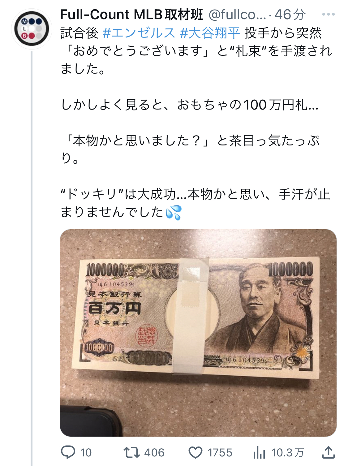 【画像】大谷翔平さん、突然ファンに『札束』を配って反応を楽しむwwwwwwwwwwww