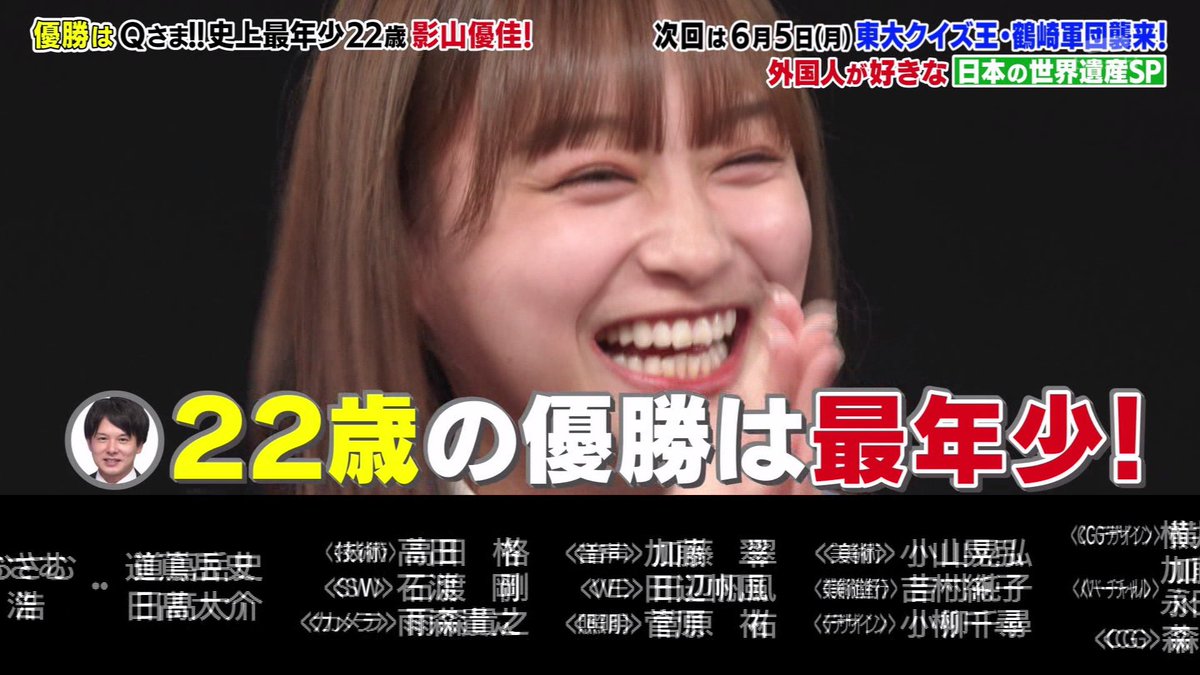 快挙!影山優佳、『Qさま』番組史上最年少優勝!