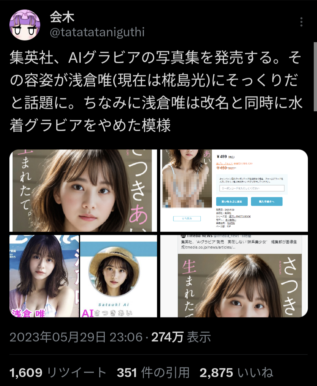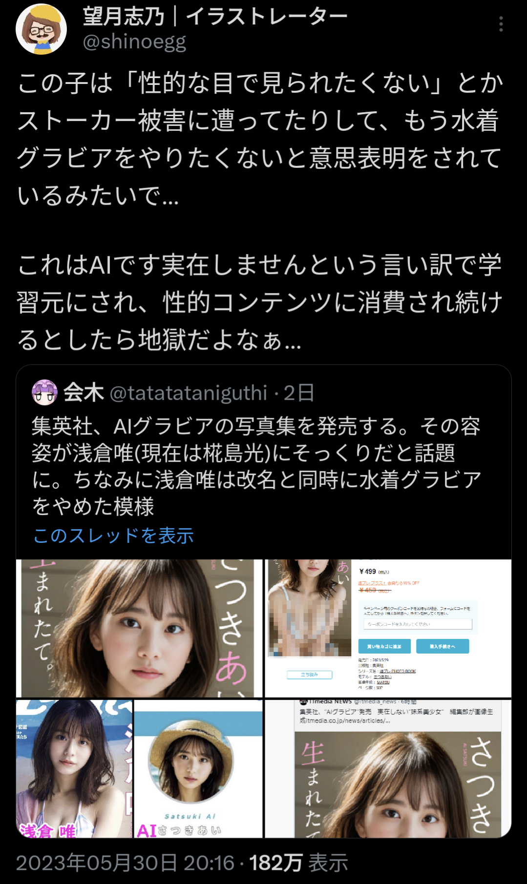 ホーム > ニュースetc > 【画像】グラビアアイドルさん「ストーカー被害にもあったので、グラビアはもうやりません。」集英社「こいつそっくりのAIグラビア作ったろw」 2023/06/08 1: 名無し募集中。。。 2023/06/01(木) 13:35:44.25 0.net @ ちなみに浅倉唯とさつきあいの身長と趣味が一致しています 続きを読む Source: 妹はVIPPER - ニュースetc