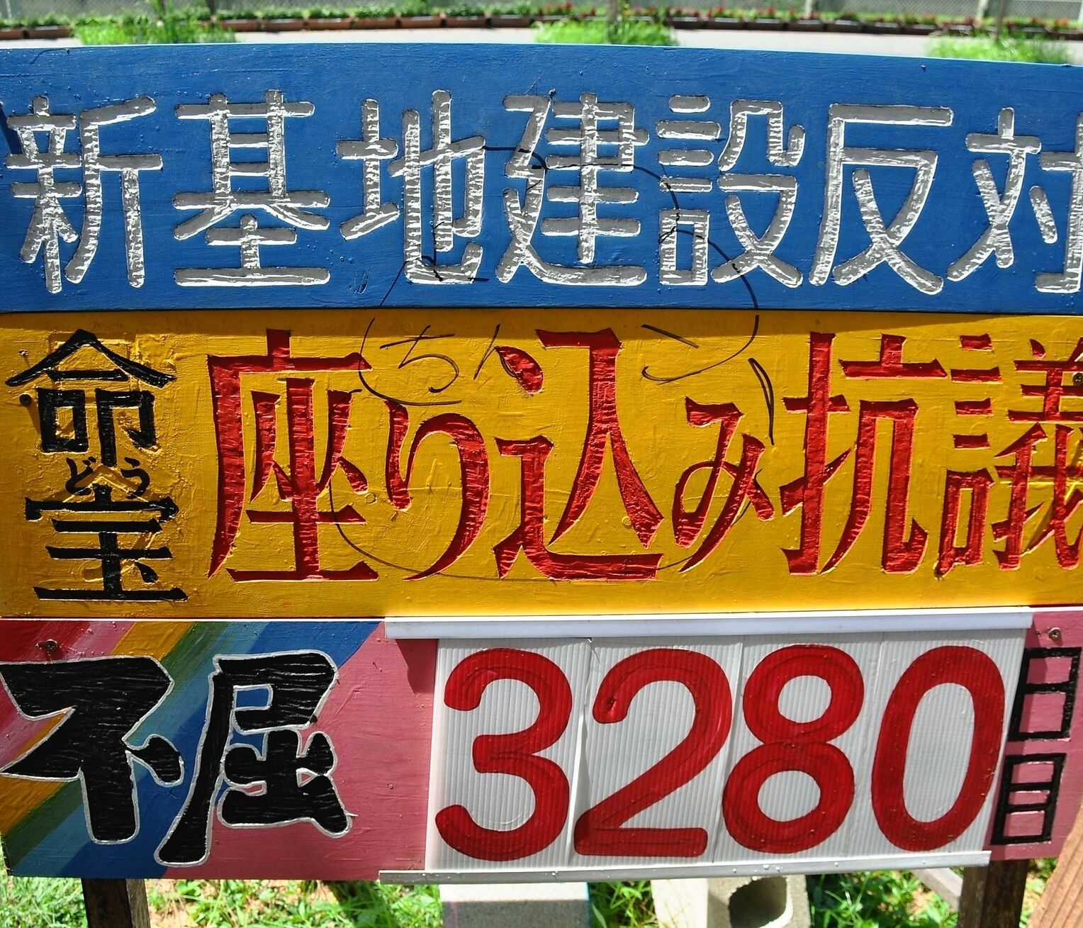 新基地抗議の看板に落書き 「平和運動あざ笑う行為」【名護】29日午前8時ごろ、名護市辺野古の米軍キャンプ・シュワブゲート前で、新基地建設に抗議する座り込み行動の日数を示す看板が落書きされているのを市民が見つけた=写真。「新基地建設反対」「命どぅ宝 座り込み抗議」の文字の上に、大便のような落書きが加えられていた。 看板は昨年10月に新調。