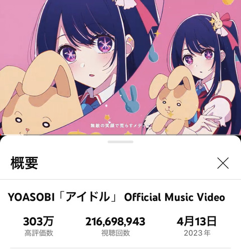 YOASOBI『アイドル』さん3ヶ月でLemonの高評価数を抜く