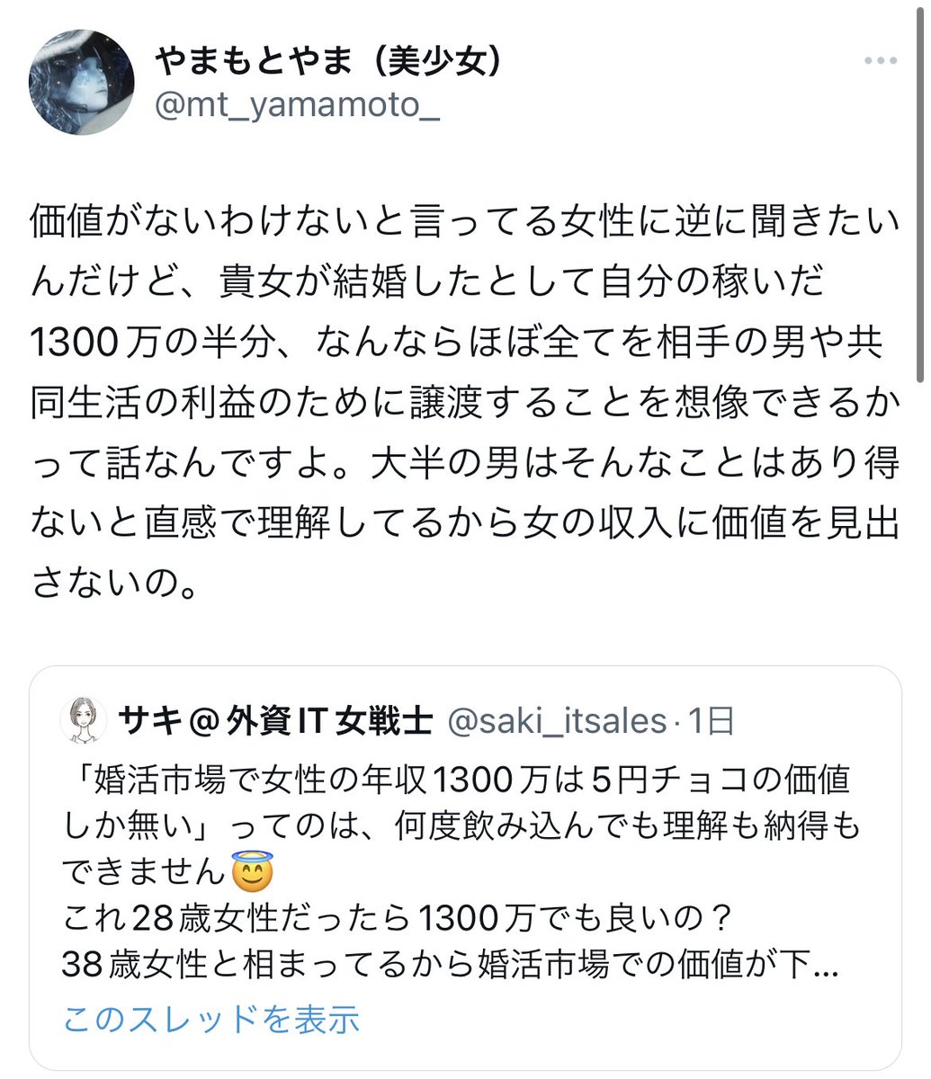 いや1300万稼いでるから年収200万の派遣の女と違って世帯所得に貢献できるから価値あるやろと外資系の女は言ってるワケよな?w