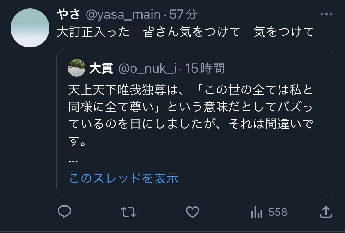 ホーム > ニュースetc > 【驚愕】日本人、「天上天下唯我独尊」の意味を完全に勘違いしていた!! 2023/08/07 1: 以下、?ちゃんねるからVIPがお送りします 2023/08/02(水) 01:49:18.152 ID:LQT2S+lyd.net X民に衝撃が走る 続きを読む Source: 妹はVIPPER - ニュースetc