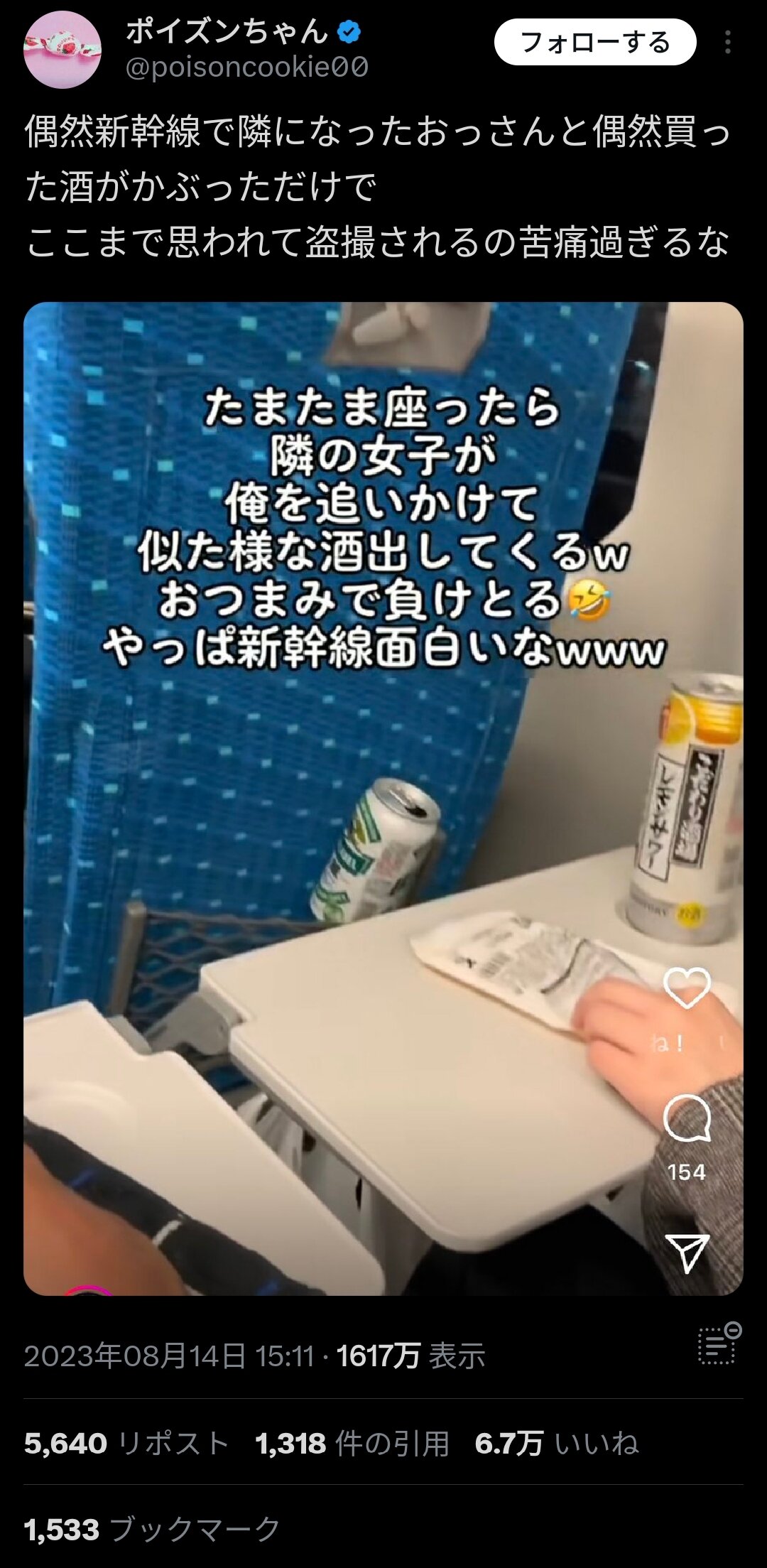 ホーム > ニュースetc > 【悲報】弱男おじ「新幹線で隣の若い女が俺の真似して酒飲んでるwおもしれー女w」パシャッ 女性「……」 2023/08/19 1: それでも動く名無し 2023/08/15(火) 03:34:15.89 ID:prmItaGqr.net 2: それでも動く名無し 2023/08/15(火) 03:35:50.84 ID:/frx+KQkr.net やーばいでしょ… 続きを読む Source: 妹はVIPPER - ニュースetc