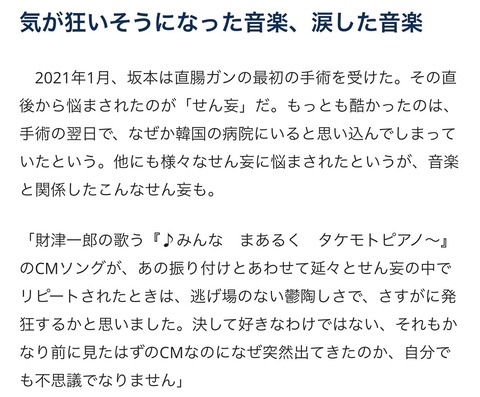 ホーム > ニュースetc > 【画像】坂本龍一さん、「タケモトピアノ」のCM音楽でノイローゼになっていた…… 2023/09/12 1:それでも動く名無し:2023/09/12(火) 20:45:34.79 ID:Q5PzegQZ0 気が狂いそうになった音楽 2:それでも動く名無し:2023/09/12(火) 20:46:22.59 ID:yPnnllcLa 草 3:それでも動く名無し:2023/09/12(火) 20:46:26.61 ID:EirndV8D0 晩餐館も食らえや 続きを読む Source: ラビット速報 - ニュースetc