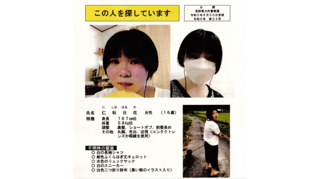 行方不明になっているのは大町市八坂の高校1年生、仁科日花(にしな・はるか)さん16歳です。仁科さんは8月29日夜10時頃、自宅にいたのを最後に行方がわからないということです。