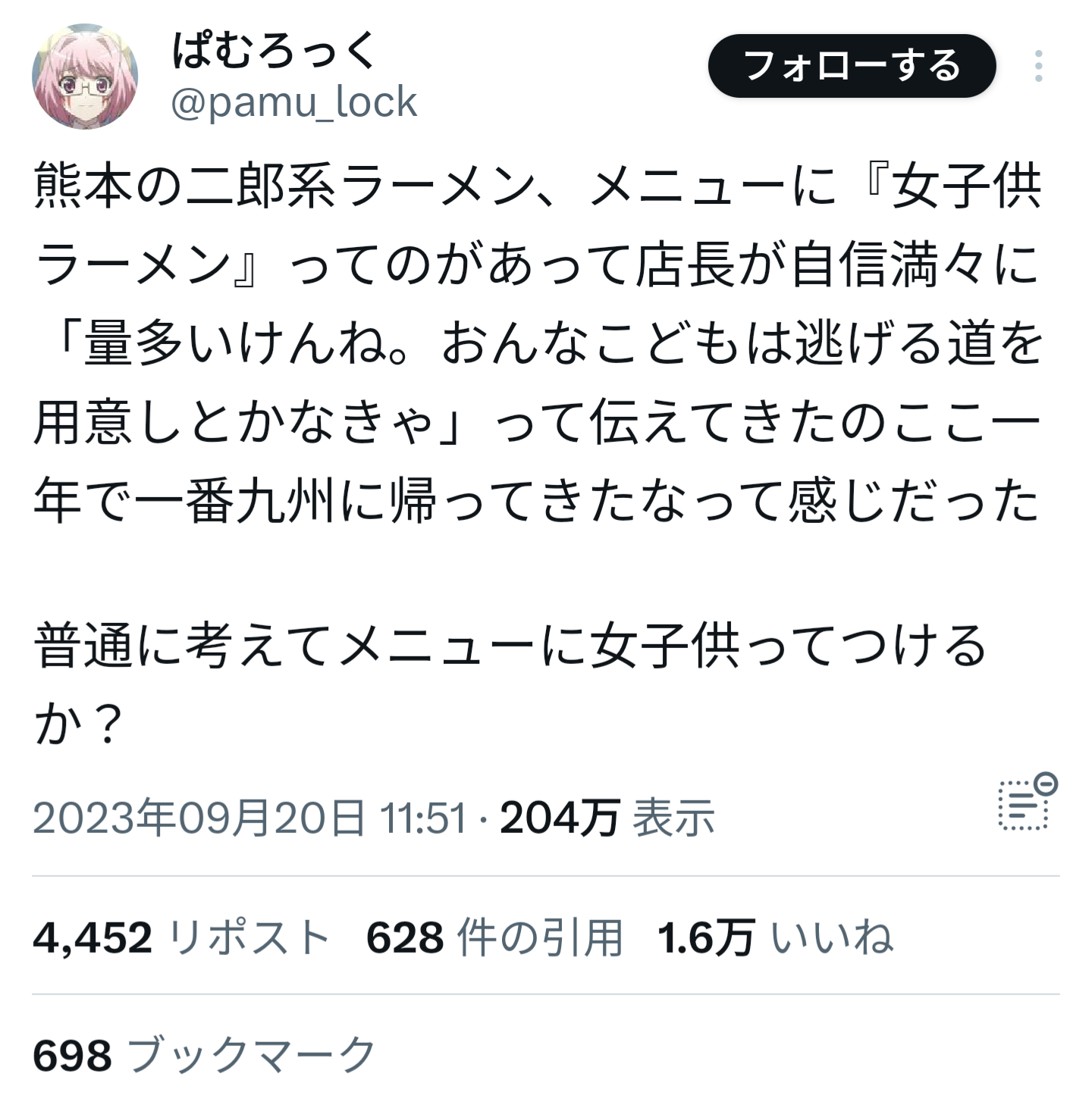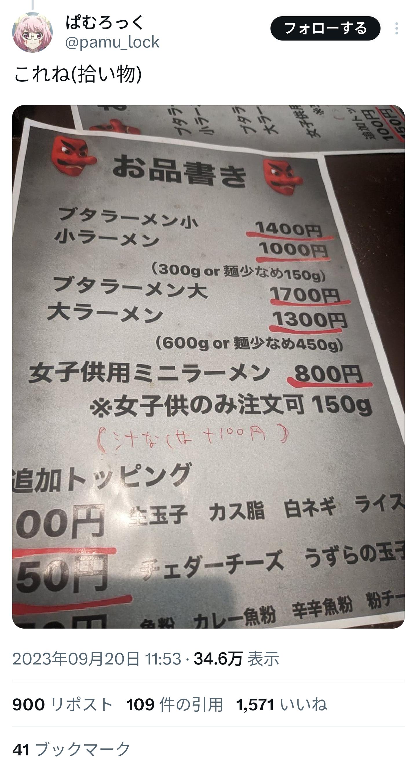 ホーム > ニュースetc > 【悲報】九州の二郎系ラーメンさん、とんでもない女性差別メニューを提供してしまう…… 2023/09/21 1: 2023/09/21(木) 12:25:29.54 ID:AZ9xvYXe0.net 女子供ラーメン 2: 2023/09/21(木) 12:25:42.76 ID:AZ9xvYXe0.net ひどすぎる…… 続きを読む Source: 妹はVIPPER - ニュースetc