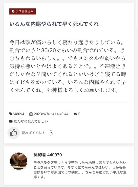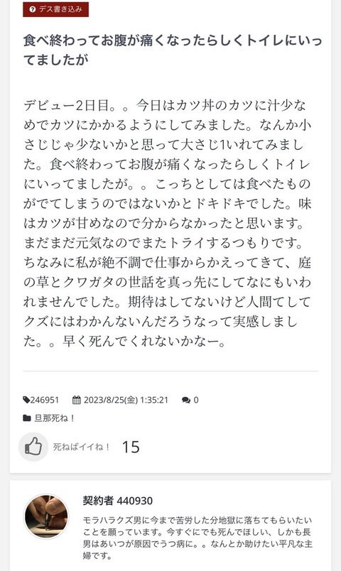 旦那デスノートで『警察にバレないで旦那を〇す方法』として不凍液を飲ませることが推奨されているのは有名だけど、二ヶ月前に投稿を始めたこのアカウント、リアルタイムで不凍液を飲ませ続け旦那が体調不良になっていく様を投稿していて流石にヤバ過ぎて言葉を失ってしまった。 pic.twitter.com/ci7LMmVlxn