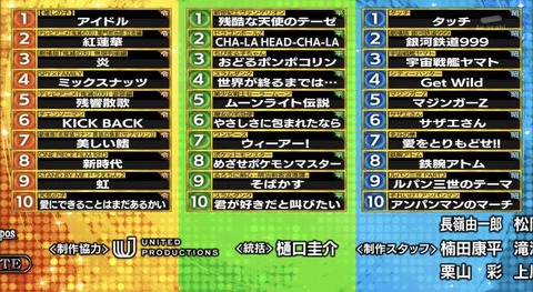 【速報】「1万人が選ぶ!ついに決定!令和vs平成vs昭和アニソンランキング」の結果wwwwwwwwwwww