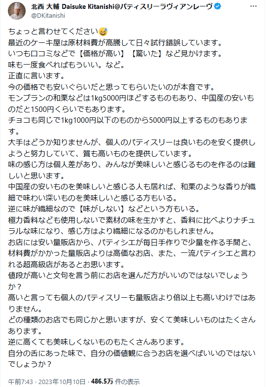 ホーム > ニュースetc > 人気パティシエ「貧乏人と貧乏舌は店に来んな」 2023/10/11 1: 名無しさん@おーぷん 23/10/10(火) 13:28:47 ID:9hmo これ普通に正論だよな味も価値もわからないやつらのせいで店の評判落とされるのダメだろ 続きを読む Source: お料理速報 - ニュースetc