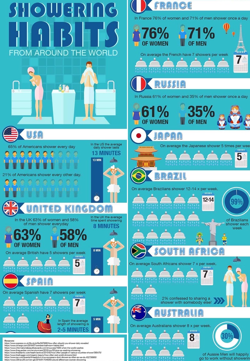 オーストラリア人:平均で週に8回シャワーを浴びる(男性の30%はシャワーせず出勤しても平気)