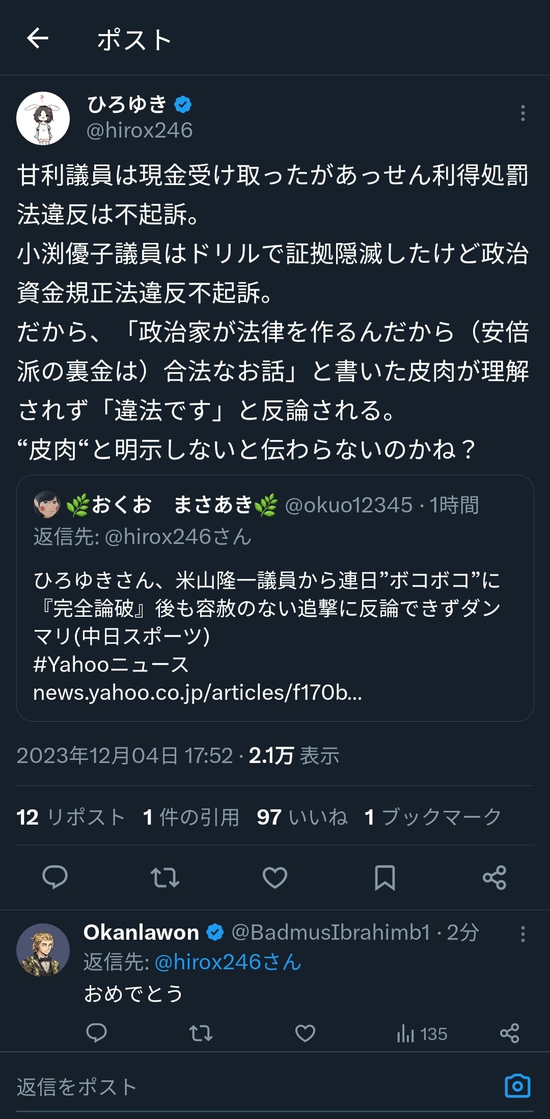 ホーム > ニュースetc > 【画像】ひろゆき、一般人にブチ切れる ひろ「皮肉も伝わらないのか!」 2023/12/05 1: それでも動く名無し 2023/12/04(月) 21:38:43.61 ID:mGAXRmkH0.net 2: それでも動く名無し 2023/12/04(月) 21:39:10.50 ID:mGAXRmkH0.net あの日以降連日キレてるな 生理か 続きを読む Source: 妹はVIPPER - ニュースetc