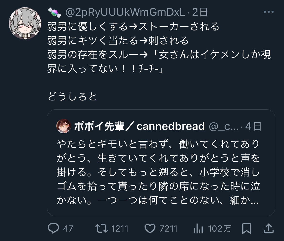 ホーム > ニュースetc > 【悲報】女さんから見た弱者男性、災害そのものだった 2023/12/26 1: それでも動く名無し 2023/12/08(金) 03:37:02.90 ID:oMzIBdZn0.net 弱男に優しくする→ストーカーされる 弱男にキツく当たる→刺される 弱男の存在をスルー→「女さんはイケメンしか視界に入ってない!!チ-チ-」 2: それでも動く名無し 2023/12/08(金) 03:37:39.51 ID:oMzIBdZn0.net こんなんとくさん並みに回避不能やんけ… 続きを読む Source: 妹はVIPPER - ニュースetc
