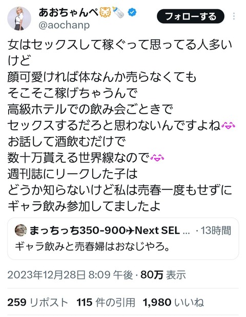 ホーム > ニュースetc > 【画像】まんさん『女は性交して稼いでるって思ってる人へ』wwwwwwww 2023/12/30 1:それでも動く名無し:2023/12/29(金) 10:00:39.31 ID:R1TbRQPn0 ええなあ 2:それでも動く名無し:2023/12/29(金) 10:01:23.86 ID:8cnlHCMx0 >>1 一番下を言いたいだけ 続きを読む Source: ラビット速報 - ニュースetc