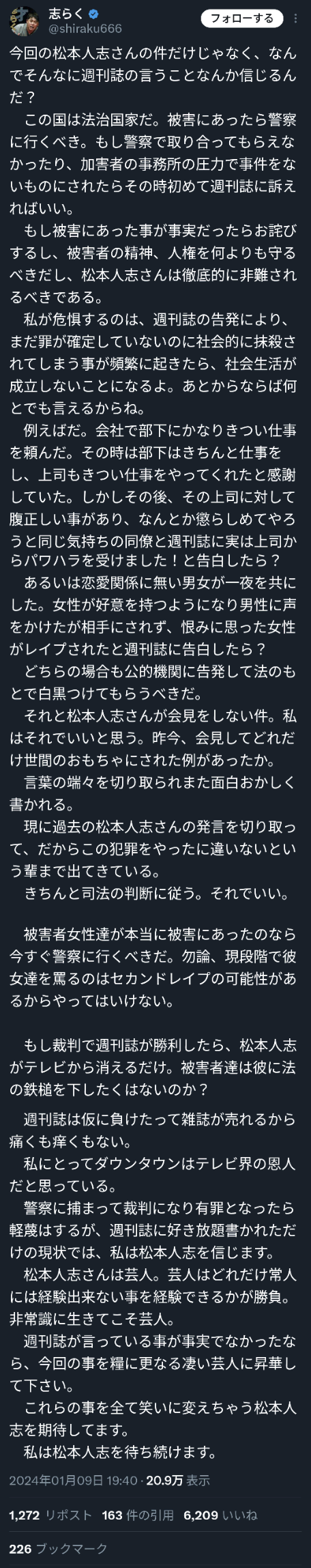立川志らく「私は松本人志を信じます。女は週刊誌ではなく警察に行け。例えば~」