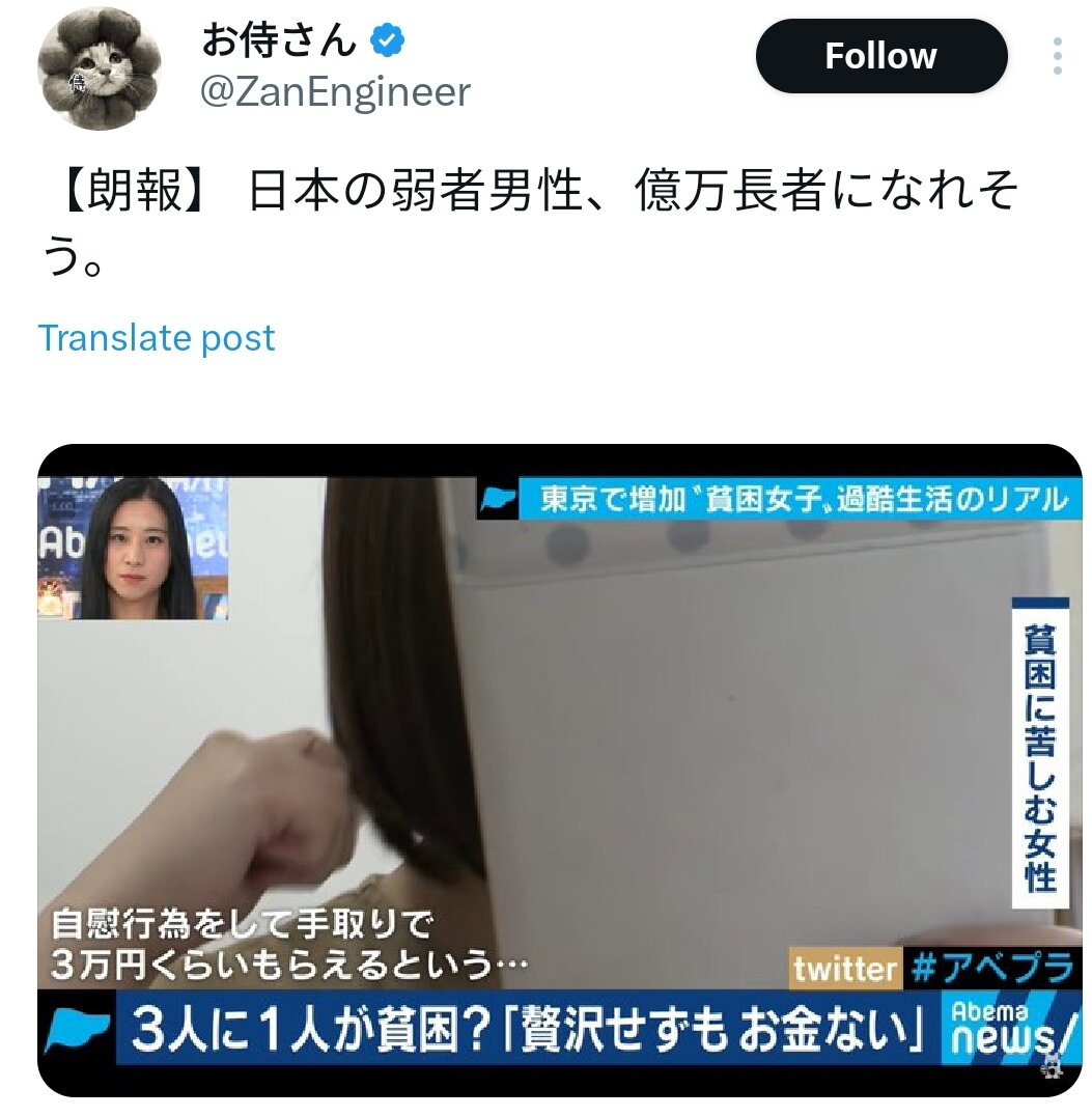 ホーム > ニュースetc > 【悲報】女の子、自慰行為するだけで3万円稼げることが判明WWWW 2024/01/11 1: 風吹けば名無し 2024/01/09(火) 23:35:27.07 ID:EpoXF451r.net 2: 風吹けば名無し 2024/01/09(火) 23:35:50.11 ID:EpoXF451r.net 弱男どーすんのこれw 続きを読む Source: 妹はVIPPER - ニュースetc