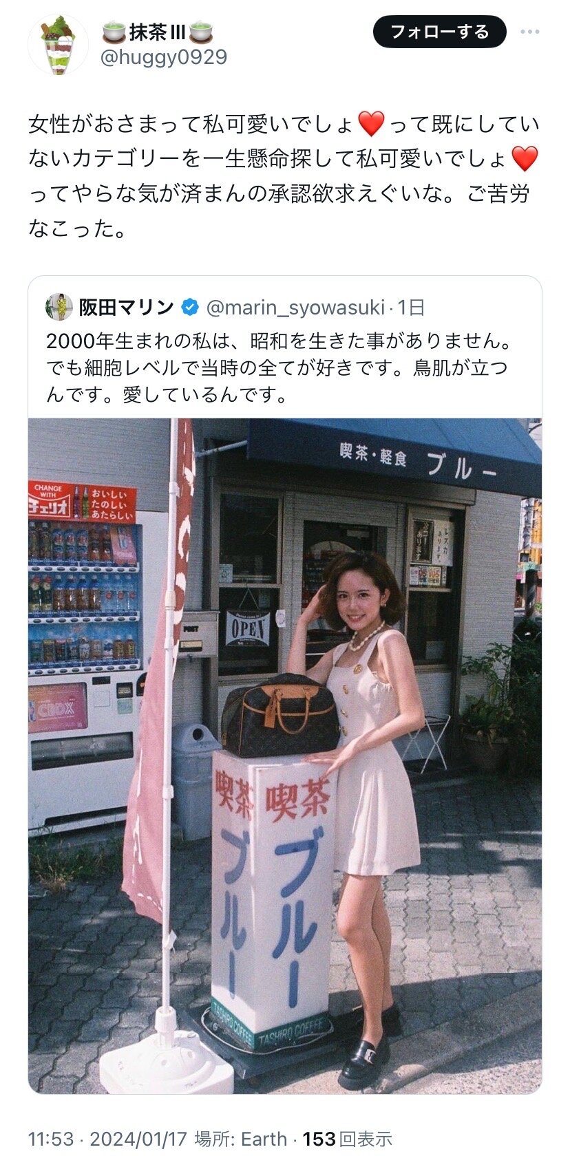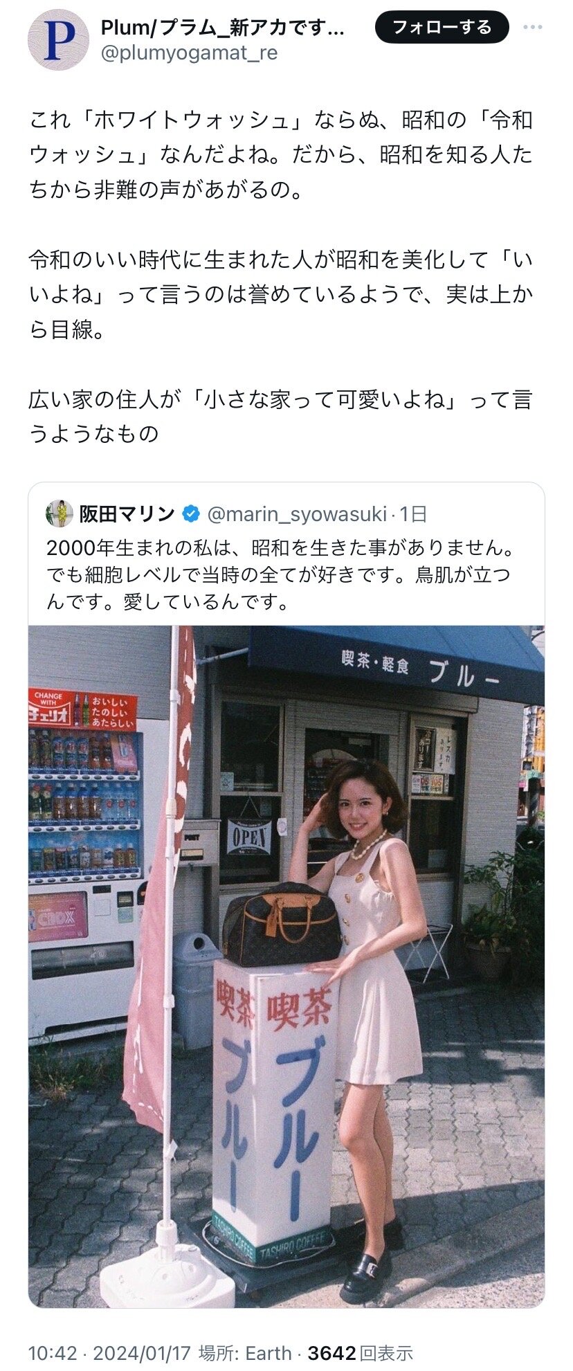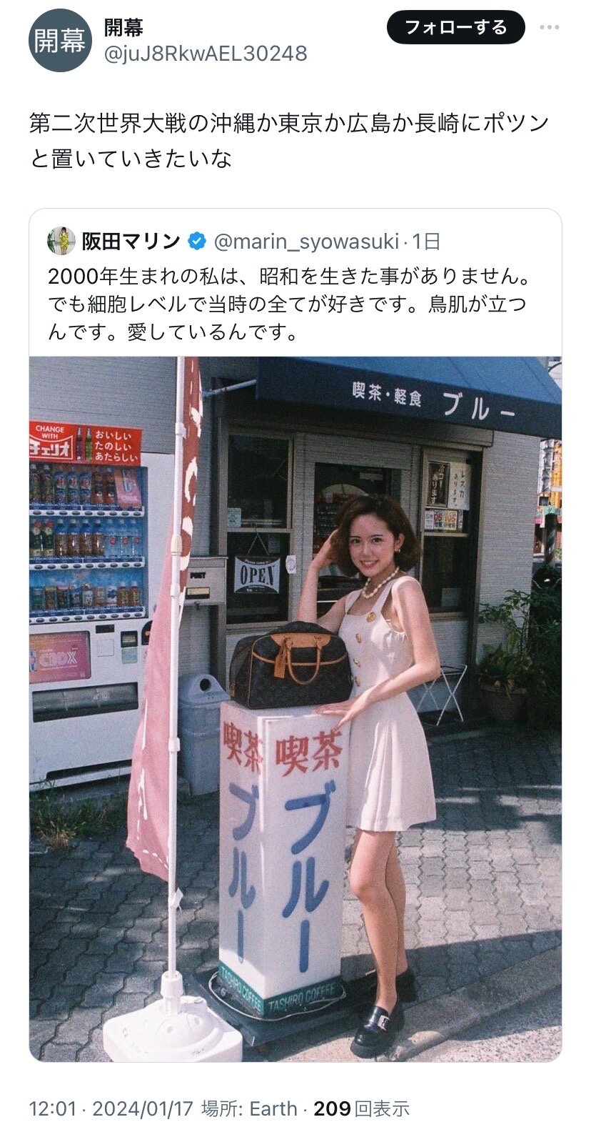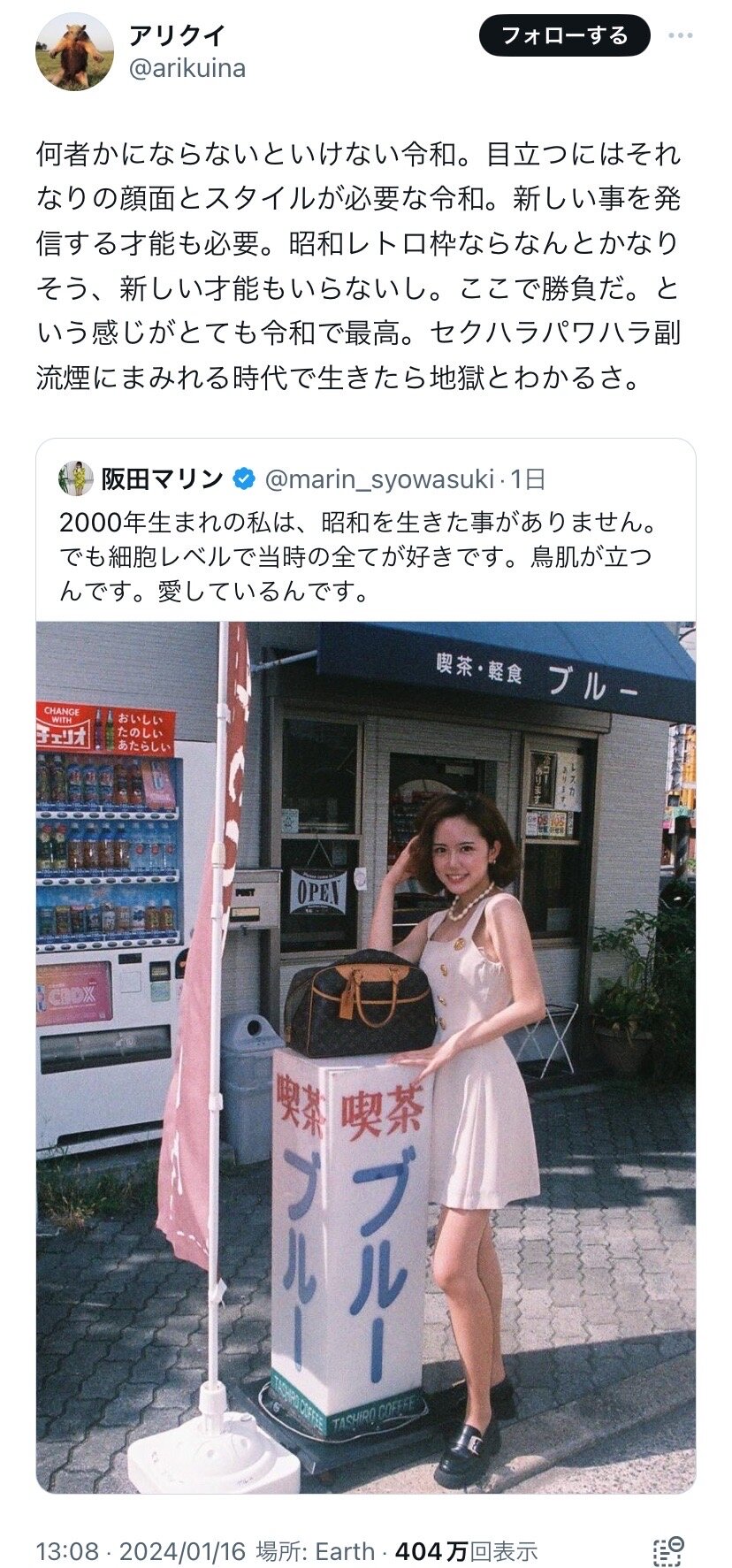 ホーム > ニュースetc > 【悲報】女性インフルエンサーさん、昭和風の写真をあげたところ昭和を知る弱者女性から叩かれてしまう 2024/01/21 1: それでも動く名無し 2024/01/19(金) 16:48:07.08 ID:hFF2UWyI0.net 2: それでも動く名無し 2024/01/19(金) 16:48:16.46 ID:hFF2UWyI0.net どうして… 続きを読む Source: 妹はVIPPER - ニュースetc