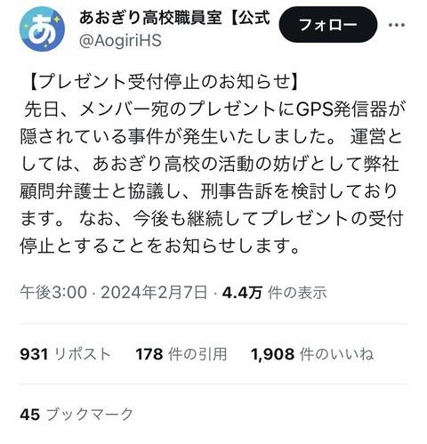 【悲報】大手Vtuber事務所「プレゼントにGPS発信機が仕込まれてた。刑事告訴します」