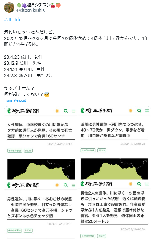 【画像あり】「治安が悪すぎる」川口市、3ヶ月間で4人の遺体が川に浮かんだ状態で発見される