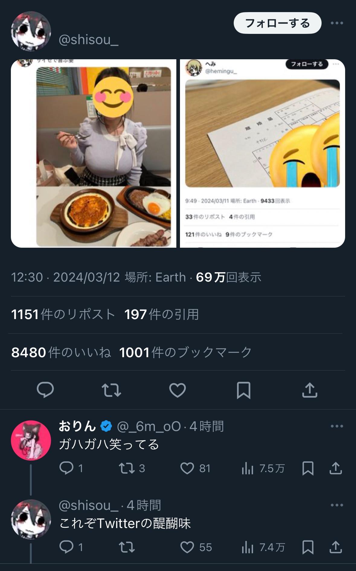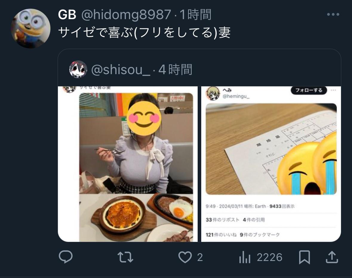 ホーム > ニュースetc > 【悲報】「サイゼで喜ぶ妻」で一躍有名になった人、離婚→Twitter(旧X)でお祭り騒ぎになる「サイゼで喜ぶ女はいない」 2024/03/21 1: 以下、?ちゃんねるからVIPがお送りします 2024/03/12(火) 17:16:18.454 ID:2Drke8p50.net 続きを読む Source: 妹はVIPPER - ニュースetc
